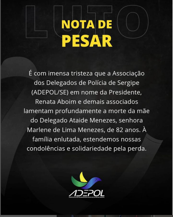 A Adepol solidariza-se ao delegado Ataíde Menezes Júnior, pelo falecimento de sua mãe, Sra. Marlene de Lima Menezes, que a família seja confortada!
